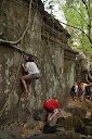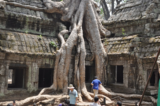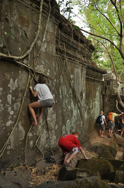 The temple was abandoned about half a century ago when Thai people invaded Cambodia. Since then the termites that softened the foundation and the trees transformed the temple into a nice "playground".