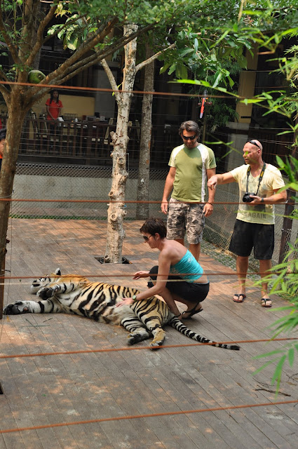 The weather was much more pleasant than we've had in the south which helped us see some stuff around. We've had a free day before the tour so we rented a driver and went around the city and ended up in local tourist attraction - tiger farm where we were supposed to pet real tigers. Quite intriguing, especially after having the experience with wild animals on Phi-Phi, but there was not doubt about it that we are going inside the cage with a live tiger.