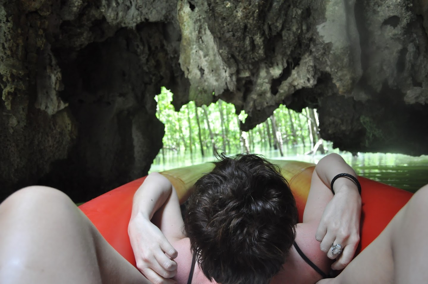At one point we had to go through a tiny cave/hole in the rock, but the kayak was just a little wider than the hole, so the guide opened the valve and deflated the kayak (forgot to tell you that the raft was inflatable). We also had to lay down flat in the raft to pass through the cave...